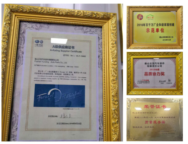 云頂汽車部件一直致力于為一線品牌汽車提供服務,憑借其專業技術,精工品質,硬核實力,獲得客戶好評,被評為2016年百千萬廠企和諧家園創建“示范單位”,獲一汽-大眾華南基地供應商“質量服務獎”,廣汽豐田汽車供應商“品質協力獎”等多項榮譽