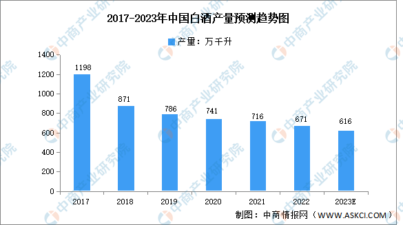 在消費市場環境變化、年輕消費者口味變化、限制“三公”消費、“禁酒令”等多方面因素的影響下,我國白酒產量逐年下降。2022年,全國白酒累計產量671萬千升,同比下滑5.6%。這是2017年以來全國白酒產量連續第六年下跌。預計2023年我國白酒產量616萬千升。