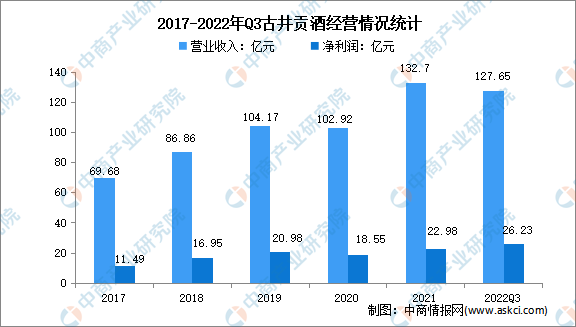 古井貢酒是中國老八大名酒企業,是中國第一家同時發行A、B兩支股票的白酒類上市公司,坐落在世界十大烈酒產區之一的安徽省亳州市。2021年,古井貢酒營業收入達132.7億元,實現凈利潤22.98億元。2022年前三季度實現營業收入127.65億元,凈利潤26.23億元。