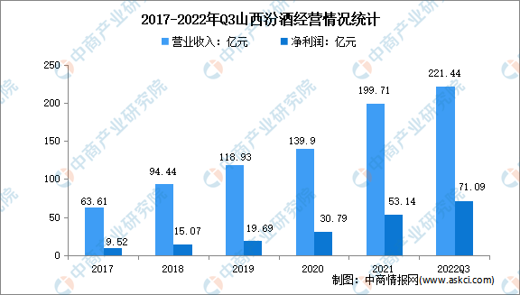 山西汾酒的主要產品汾酒是我國清香型白酒的典型代表,竹葉青酒是著名的保健養生酒,在國內外享譽盛名。山西汾酒2021年實現營業收入199.71億元,凈利潤53.14億元。2022年前三季度實現營業收入221.44億元,實現凈利潤71.09億元。